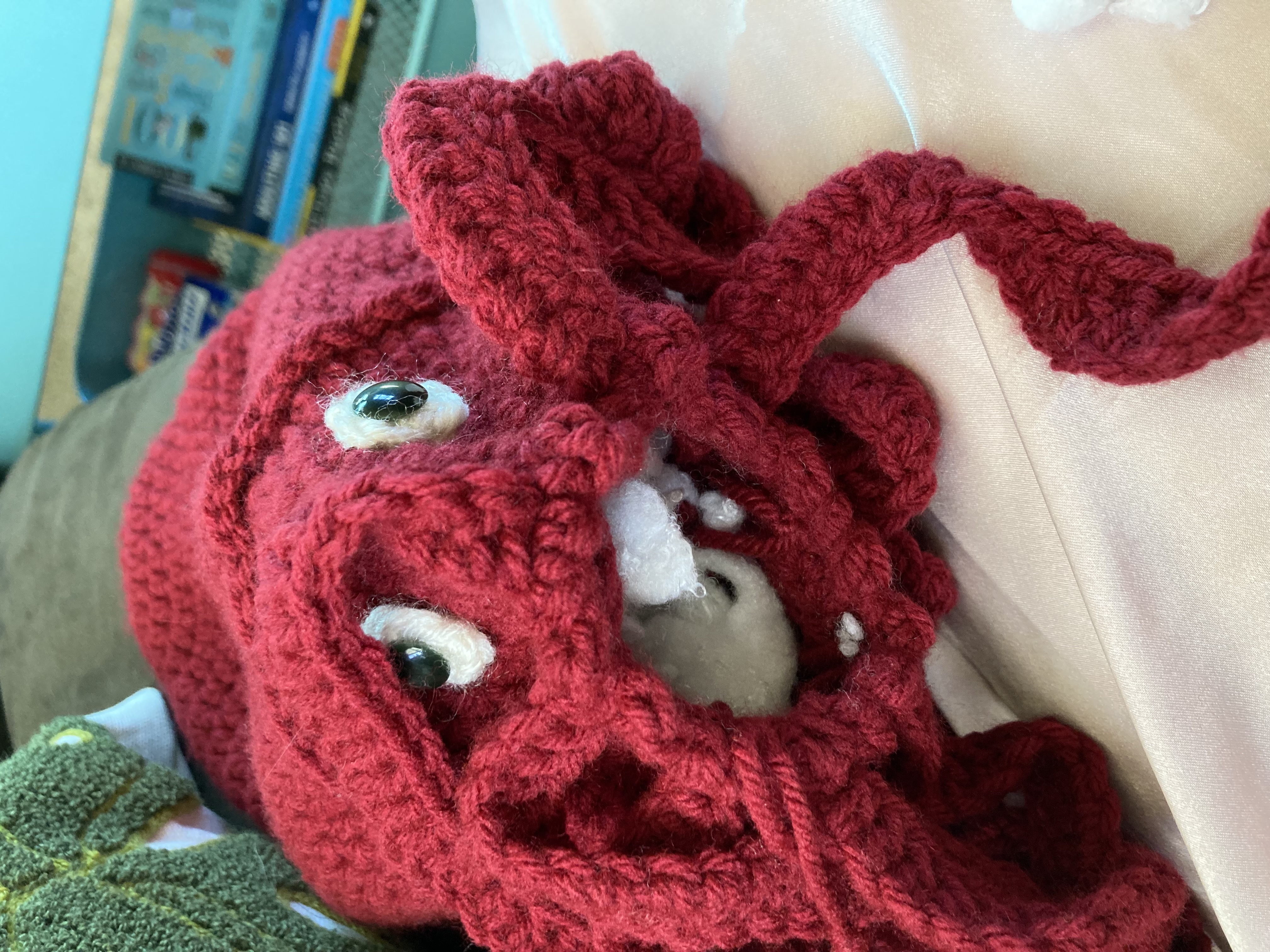 This is where I stuffed and finalized the squid! I used some old buttons for the eyes and cinched the bottom. I additionally made two more long legs, as squids have. This is a project that came completely from my own brain and of my own creation. I never remake the same craft and each of my works is unique!